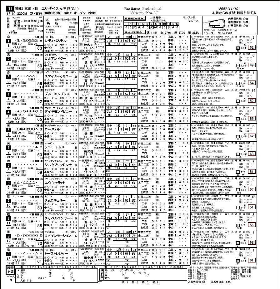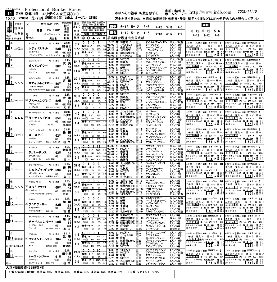 BB(番記者番付・旧バンカーバスター)情報をメインにした、情報に特化した内容の新聞です。BB判定のほか、調教指数・厩舎指数のより細かい分析・成績を掲載しています。 なおご覧になるためには、Adobe Acrobat ReaderがPCに組み込まれている必要があります。
